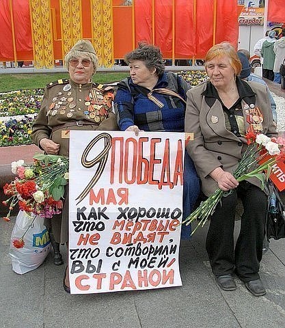 Da sinistra: Veterani per Stalin; “9 maggio. Vittoria. Meno male che i morti non vedono quello che hanno fatto del mio paese”