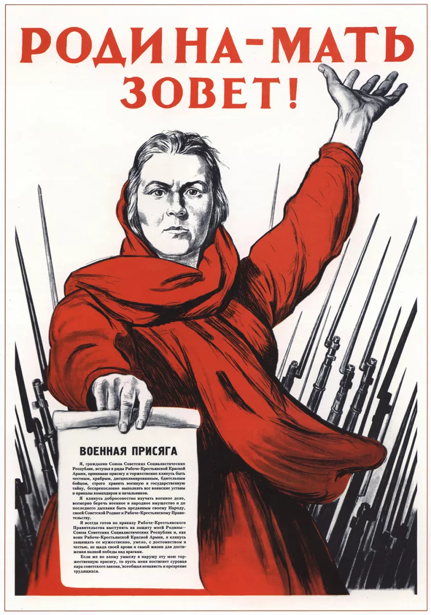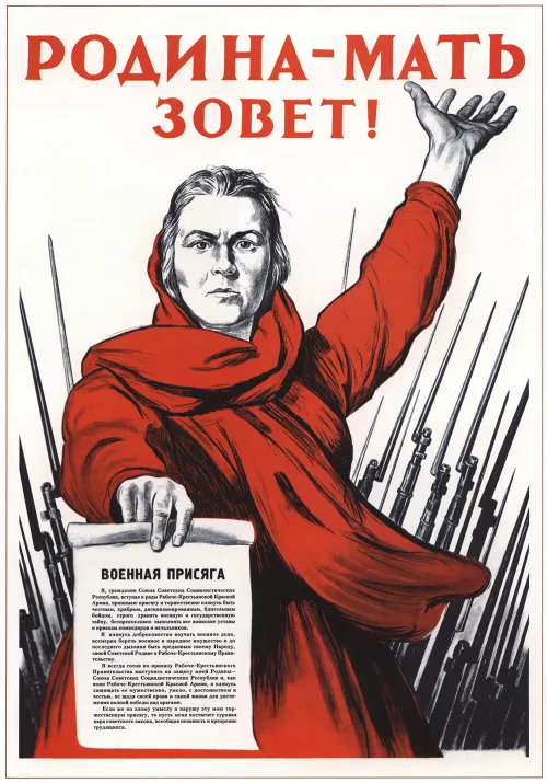 Di sobrietà quasi assoluta, specchio anche dei mutamenti sociali e politici succedutisi nei quasi dieci anni intercorsi, è stata la parata del 2014. Un cielo terso e un sole limpido illuminavano una piazza Rossa su cui la scomoda mole del Mausoleo di Lenin era stata avviluppata e nascosta con pannelli che riproducevano scene di fuochi d’artificio e ostentavano la fatidica data: 9 maggio 2014. Ingenuo e un po’ sprovveduto artificio che, se vogliamo leggere con gli occhi dei teorici della non-monumentalità, cioè di quelle operazioni impostate non sull’evidenziazione ostentata del scultura commemorativa, ma sulla sua apparente o voluta dissimulazione (pensiamo a uno dei casi più macroscopicamente noti, le impacchettature di Christo), tesa a renderlo più “visibile” che mai, anche agli occhi di chi avesse lo sguardo offuscato dalla consuetudine o dall’indifferenza. La voce stentorea dello speaker radio-televisivo, ispirata sia nel timbro che nell’intonazione a quella mitica dell’annunciatore di tutti gli eventi che avevano fatto la storia dell’Unione Sovietica Jurij Levitan, diede inizio al collegamento pochi secondi prima che l’orologio del Cremlino battesse il suo carillon e poi le dieci. Putin, accanto a Medvedev, questa volta si limitò a un red carpet ridotto e abbreviato, stringendo mani sulla tribuna a ospiti e veterani, lasciando il primo piano, e la lenta traversata della piazza in tutta la sua lunghezza al drappello d’onore che portava la bandiera della Federazione Russa e l’ormai leggendario vessillo della vittoria, mentre la banda scandiva le solenni note di Svjaščennja vojna (Sacra guerra), canzone del 1941 assurta a inno della guerra: “Levati, Paese immenso, levati per una lotta mortale”! Poche e altrettanto sobrie le gigantografie che riproducevano il manifesto della severa e corrucciata Madre Patria che chiama a raccolta i suoi figli e alcune delle più prestigiose onorificenze per gli eroi militari.