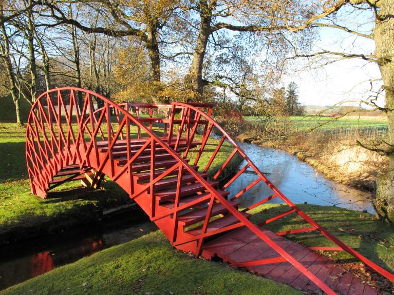Un passo ulteriore è stato compiuto in un altro luogo importante per l’estetica dei giardini contemporanei, cioè a Lower Portrack. Charles Jencks, architetto, filosofo e teorico del postmoderno, fece costruire nel suo “Giardino della speculazione cosmica” un Jumping Bridge, un ponte sorprendente. L’oggetto rosso, dotato anche di una piattaforma che funziona come un pre-ponte, è inconsueto poiché calcolato e ideato secondo le leggi matematiche. Come le altre follies del giardino dimostrativo di Jencks, anche quest’artefatto permette di immedesimarsi nei segreti della natura, espressi nella fisica e nella matematica odierna, attraverso l’esperienza sensibile. Il ponte rosso, che assomiglia a una scultura, ha una struttura dinamica e viva. L’oggetto concreto, creato ad arte, illustra la geometria frattale. La bellezza irregolare viene intesa qui come un invito a guardare “dietro” le cose. Nella sua parte centrale, il Jumping Bridge diventa una specie di ponte-panchina. Sedersi lì e guardare intorno, può aprire nuove prospettive sul paesaggio circostante.