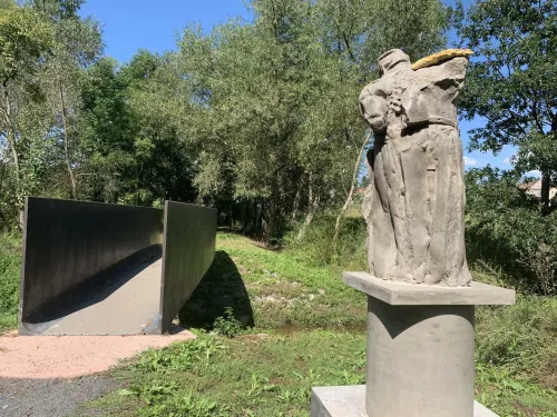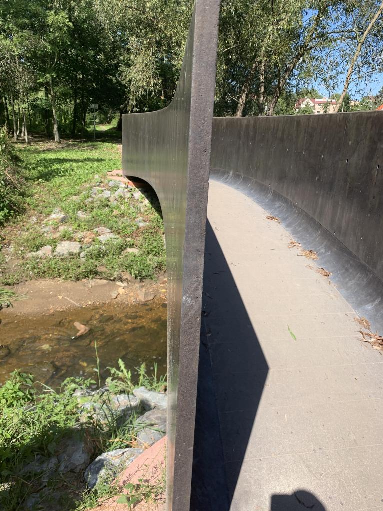 Alla vista del ponte però tutto cambia. La sua leggerezza estrema stupisce, e quasi invita i visitatori a esperirlo in modo tattile. Il cemento sembra vivo, una pelle, piuttosto che un materiale inerte. Informandosi, si può scoprire che la costruzione di un ponte così esile ed elegante è frutto delle tecnologie di punta odierne, cioè dell’utilizzo di UHPC (Ultra High Performance Concrete) di ultima generazione. Difficile resistere: i visitatori provano tutti l’impulso di riaccarezzare le pareti del ponte. La materia leggermente porosa rammenta la superficie di vasi oppure delle rocce di origine vulcanica. Inoltre, il ponte, di un nero intenso, contrasta con la vegetazione rigogliosa. È un ponte ma pure un oggetto plastico. La sua qualità maggiore sta nel fatto di non essere monumentale. Viene in mente il saggio di Rosalind Krauss, Sculpture in the Expanded Field, in cui la grande critica americana analizzava il fenomeno di progetti di scultura che vanno oltre “the logic of the monument, entering the space of what could be called its negative condition – a kind of sitelessness, or homelessness, an absolute loss of place”. Pur essendo saldamente ancorato al suo sito, il ponte sul Dřetovice non celebra che la sua presenza epifanica. L’unico elemento semantico è la statua di Giovanni Nepomuceno, a qualche passo dal ponte. La statua realizzata da Jan Hendryck è storicamente sovradeterminata. Nepomuk, il santo controverso, identificato a volte addirittura con il grande riformatore Jan Hus, rappresenta l a storia della Boemia. Legato all’acqua (la leggenda lo vuole martire nella Moldava) e ai ponti (lo si incontra per esempio sul Ponte Milvio), è la figura ideale in questo ambito. Se il ponte si dà come forma e materialità pura, questo Nepomuceno, forse proprio perché vicino al ponte, acquisisce anch’esso la purezza e la forza del segno poetico.