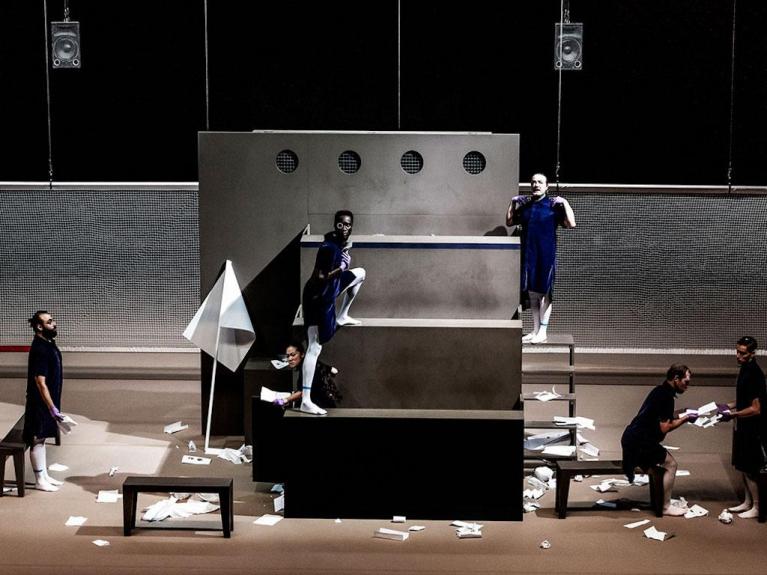 Non meno sottilmente crudele è lo sguardo sull’umano di Marlene Monteiro Freitas, che condensa nelle due vorticose e lussureggianti ore di Mal-Embriaguez Divina, tutti i volti nefasti dell’homo civilis. Come un tritacarne – che fagocita istanze, tic e storture del nostro immaginario per poi risputarle fuori mescolate e deformate – la coreografa compone con bandiere nazionali, corone, inni, sirene di guerra, soldati, partite sportive e riti sacri. In platea si resta talmente sommersi da questo blob a un tempo energetico e disturbante da perdere ogni certezza. Intanto, sul palco, una geometrica struttura a gradini – un po’ Tribunale, un po’ Parlamento - ci ricorda le istituzioni fondative del nostro vivere civile. Ma sopra vi albergano e vi legiferano degli esseri crudeli e scimmieschi: un’Orestea animalesca e senza conciliazione, perfetta per raccontare le macerie di questo Millennio.
