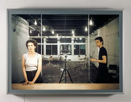 Posizionata su un supporto retroilluminato, esattamente a metà del percorso dell’esposizione, Picture for Women di Jeff Wall sembra spingere ancora più in là la riflessione, coinvolgendo la questione della contaminazione tra i medium, del dialogo tra le tecniche e le discipline su un terreno espressivo di intersezione: l’immagine, con il suo gioco di specchi, di sguardi e di luci si configura come una mise-en-scène in cui, coerentemente con il credo di Wall, alla dimensione documentaria della fotografia si affiancano elementi finzionali tipici del cinema o del teatro – dalla fotografia come rappresentazione aderente al reale (traccia del reale) alla costruzione artificiale del reale da rappresentare in fotografia. Non è un caso che il supporto luminoso dell’opera, la lightbox retroilluminata, sia una sorta di schermo: la retroilluminazione, ci ricorda Elio Grazioli, produce un effetto “alquanto particolare, allucinatorio: è come se le immagini ci si rivolgessero, vengono verso di noi, pur mantenendo una piena distanza e intoccabilità. C’è sempre nell’arte di Wall questa duplicità, che ne costituisce tutta la stranezza ed enigmaticità, il compimento dell’autonomia modernista dell’immagine e al tempo stesso la sua invasione del mondo reale. Non solo ‘scrittura di luce’ ma anche ‘emanazione di luce’, e con essa di scrittura e di immagine”.
