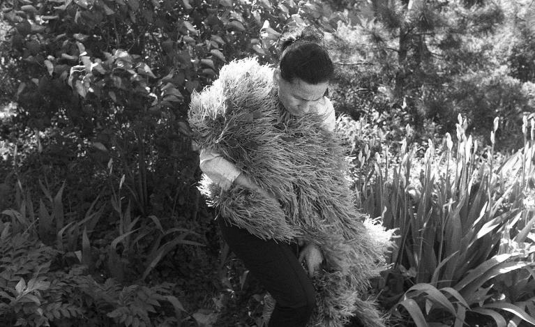 76° giorno dell’invasione, Dimostrazione di Irina Balan della copertura mimetica per cecchini fatta in fibre ricavate dai sacchi di polietilene.