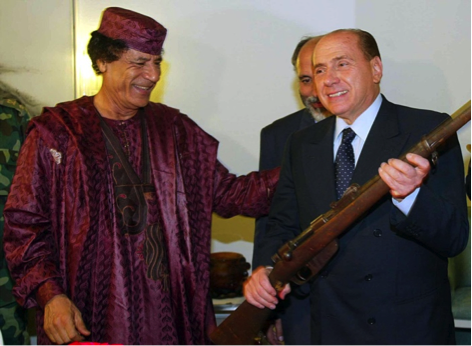 October 28, 2002. Libyan leader Muammar Gaddafi gifts Berlusconi with the last Italian rifle (?) left in Libya, Tripoli (ANSA press agency).