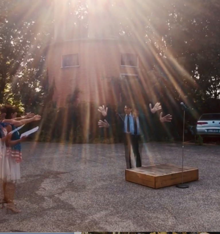 Sono seduta da sola, nella stanza. Andrea entra, viene alla scrivania, dietro di lui c’è la libreria, davanti il computer. Riceve una chiamata Skype. È un’intervista, gli fanno delle domande e lui risponde.