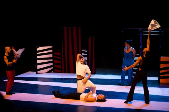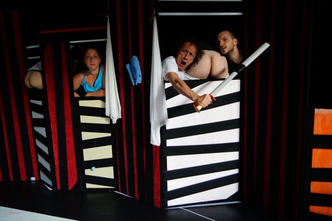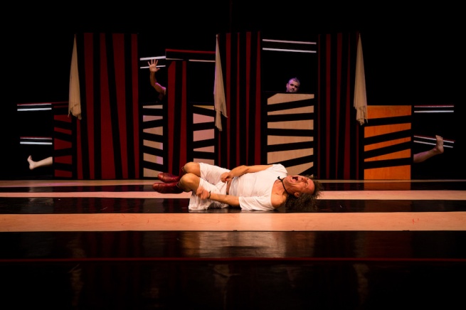 Salta, parla, parla quasi senza fermarsi mai Antonio Rezza nell’ultimo spettacolo. Come nei precedenti lavori, si dimena nella scena (“habitat” li chiamano loro) disegnata come sempre da Flavia Mastrella. Questa volta non sono stoffe tagliate come un quadro di Fontana da cui far apparire facce deformate, gambe, braccia, pezzi di corpo, personaggi, e non sono neppure strutture leggere, sempre principalmente di stoffa, da indossare, da penetrare, da far dilagare nel palcoscenico. Sono edicolette o teatrini o spogliatoi coloratissimi, leggeri, modulari, spostabili, con interferenze di zebrature, bianchi e neri, neri e rossi, con tendine e veli, che servono a celare, a rivelare, sempre loro, personaggi evanescenti, come noi tutti, corpi scomposti in un delirio futurista, dadaista, cubista. La differenza con i precedenti lavori, tutti ormai di culto, molti ancora in repertorio e in tournée (vedi sul sito della Compagnia Rezzamastrella), è che in Anelante il palco si popola di altre presenze oltre a quella dell’attore romano, Ivan Bellavista, Manolo Muoio, Chiara Perrini, Enzo Di Norscia, controfigure fisiche del protagonista, ipercinetiche come lui, coro di brusii più che di voci, dotato solo di parole incomprensibili, sovrapposte o senza senso.