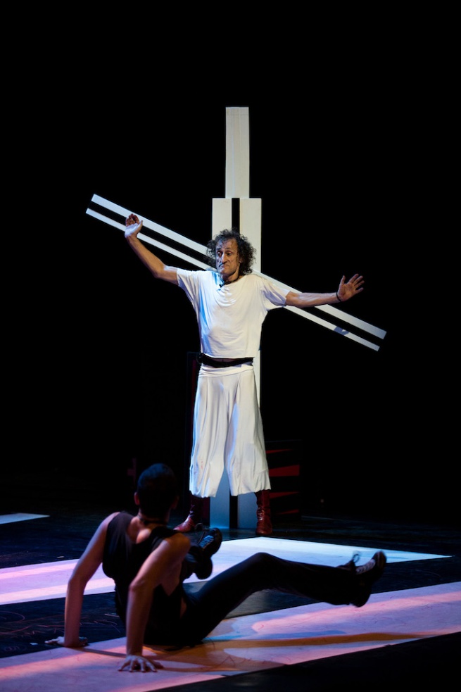 Attraversa la matematica, la scienza, la religione, la famiglia, il sesso, la politica dei grandi, la psicanalisi, le nostre personalità sempre più instabili, la vita, la morte, sbeffeggiando tutto, rovesciando cento volte le cose note, con i cateti di Pitagora che diventano cateteri di anziani che è inutile che si dannino per la misera pensione perché li aspetta al varco la fine (“tanto devi morì” dice, verso i toni acuti, con perfida vocina). E Freud si insinua in sonni inquieti da cibo pesante e innesca mostri di amori familiari, io innamorato di mio padre, lui di mio nonno, e mia madre dove la mettiamo? I grandi della terra appaiono e scompaiono nel teatrino in un balletto in cui per fare i G20 ne mancano sempre 14 o 15 o 16 o 17 o tutti – uno su, uno giù, gli attori, uno in una casetta, l’altro nell’altra, e il primo che scompare e riappare, e via, in una sarabanda. Ma non va meglio con un G12 o un G8 e così via, fino a un G5 più realizzabile dal numero degli attori, ma non ci sono mai tutti oppure uno muore e la dipartita diventa osceno funerale orgiastico, completo di sodomie e masturbazioni, con un Cristo che scende da una croce dal braccio obliquo per partecipare, in una esilarante danza macabra dopo una parata di culi e di voli pericolosi che portano tra il cielo e il desiderio, con quel Cristo che talvolta guarda, forse interviene a scampare disgrazie, forse no.