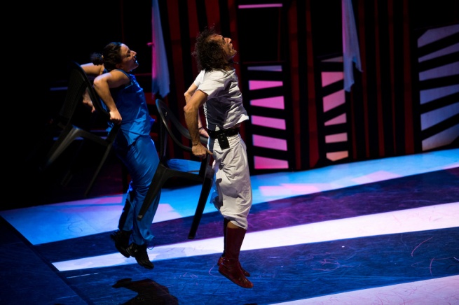 Questo spettacolo è sempre corso fino al soffocamento, da questa marionetta insidiata dalla presunta esattezza scientifica di un mondo approssimativo, che con la sua purezza geometrica certificata dai grandi scienziati, Pitagora, Keplero, Copernico, Newton, in leggi matematiche inoppugnabili, in vertiginose radici quadrate, inocula sempre e soltanto sofferenza, nevrosi, instabilità. Rezza – volto contratto, voce deformata in maschera di infantile ingenua perfidia – dirige le danze ora scrivendo inutili formule matematiche sulla grande lavagna del pavimento attraversato, come le edicolette, da interferenze coloristiche simili a faglie, a fratture di terremoti, a crepacci dell’anima. Le sue controfigure si scompongono in gambe, braccia, volti, natiche, ritmici incalzanti salti sulle sedie, a simulare un altro unico corpo allungato, dilatato, moltiplicato, suppliziato. Sade domina questa scena del sacrificio sull’altare della banalità quotidiana, sempre colorato con tono di anarchico sberleffo. In uno sproloquiare senza requie, come sempre negli spettacoli di questo contorsionista della parola ospitato da morbide colorate leggere strutture architettoniche di Flavia Mastrella simili ad abbracci aperti sul vuoto, i veri protagonisti si rivelano il linguaggio e le sue malattie, le sue ipertrofie narcisistiche che cercano di coprire gli sprofondi di solitudini troppo fragorose, troppo devastanti, e l’insensatezza dell’agire.