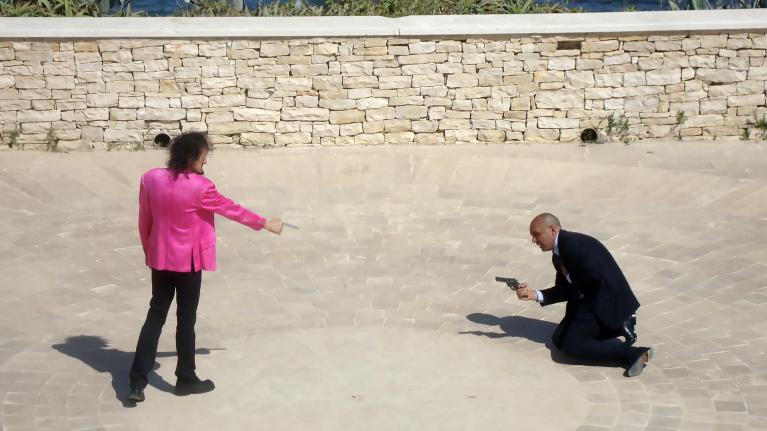 Tra ulivi, trulli, strade bianche di Ostuni, muretti a secco, scalinate di Gravina di Puglia, linee ferroviarie deserte, la piazza di Galatina dove non si può che ballare una ossessiva, folkloristica pizzica. Un killer attraversa questo Puglia Dreaming: boccoli lunghi agitati dal vento o dalla corsa, simile a un Cristo pasoliniano su un campo di grano tagliato, con baffo, pizzetto e volto sghimbescio, giacca rosa su corpo magro, lisergica, nervosa reincarnazione di Frank Zappa in cerca di tradizioni da uccidere, da killerare.