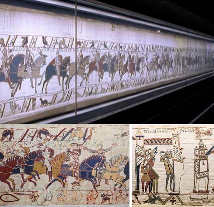 Arazzo di Bayeux, seconda metà del secolo XI, realizzato in Inghilterra o in Normandia. In alto: visione d’insieme. In basso: dettaglio di scena equestre; la cometa di Halley. Come si può vedere nel ricamo compaiono Titula et inscriptiones, nella miglior tradizione medievale della doppia lettura di immagini e testo.