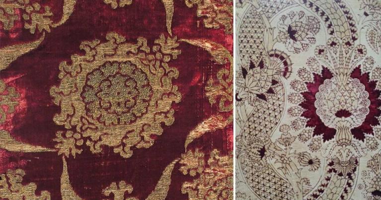 Due esempi di tessuti auroserici milanesi quattrocenteschi. A destra: frammento di velluto, broccato e bouclé in oro, 1460-1475 circa.