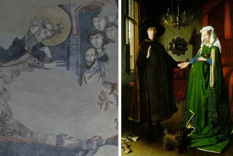 Il silenzio di Zaccaria, affresco, secolo VIII, Benevento, Sanra Sofia. Jan van Eyck, I coniugi Arnolfini, 1434, Londra, National Gallery.