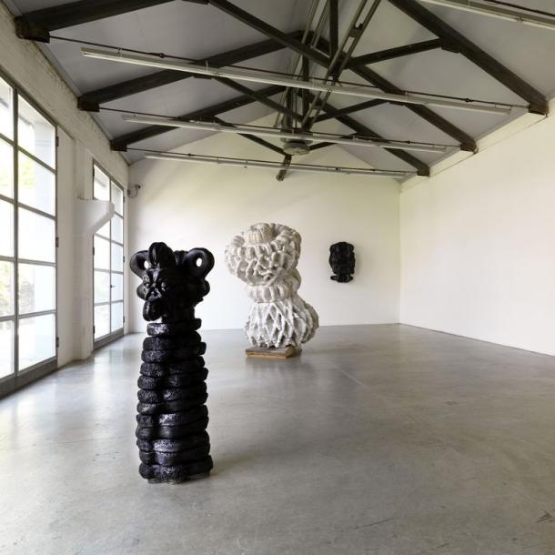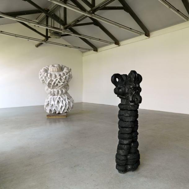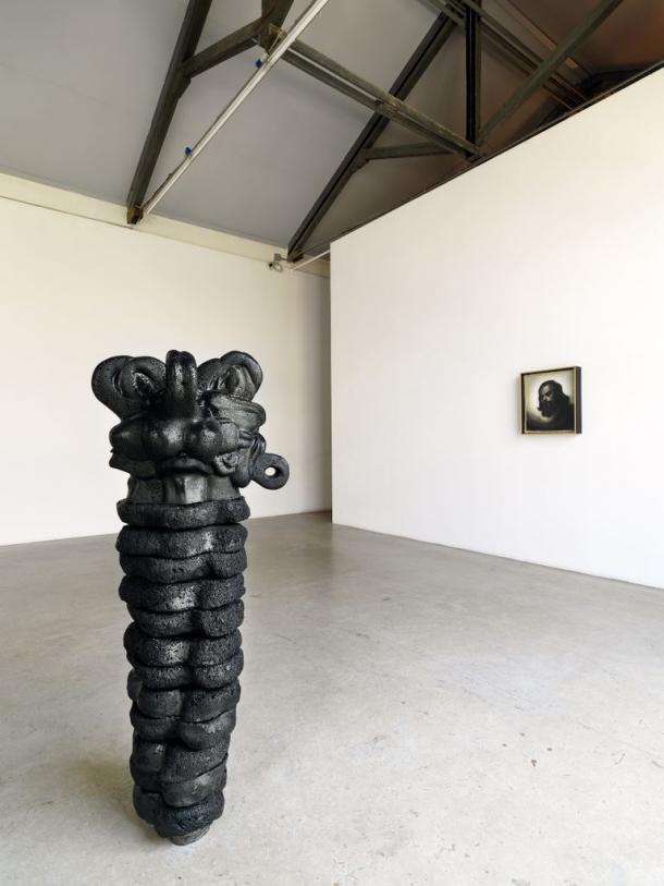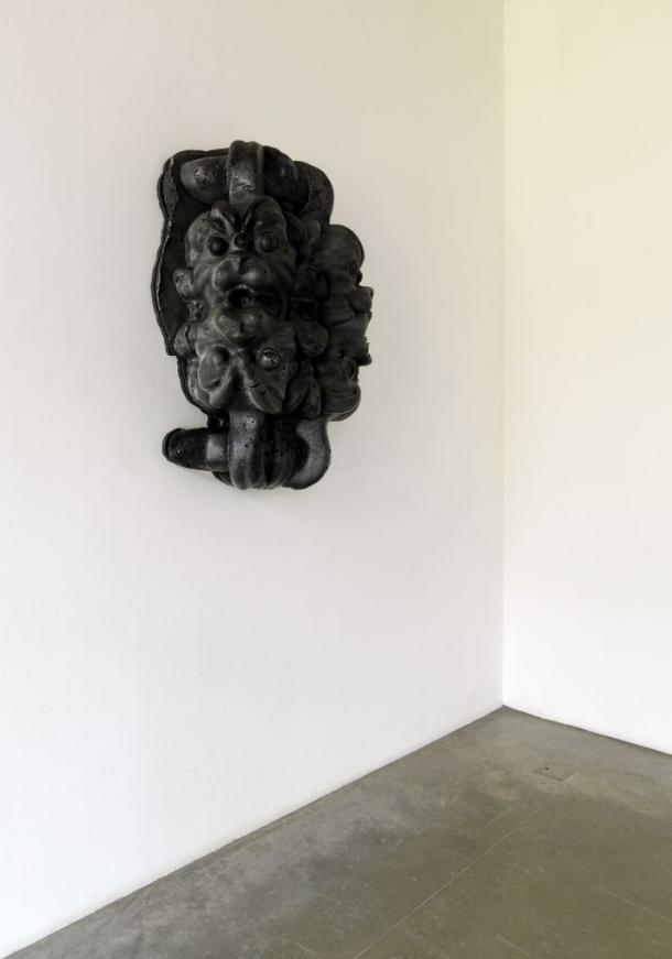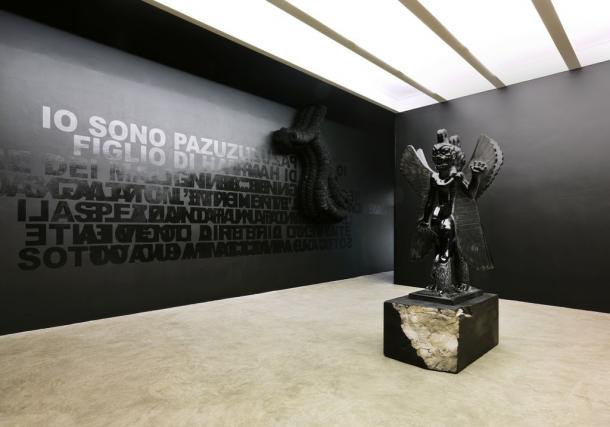 Al centro della stanza impera la statua nera del Dio Babilonese Pazuzu. L’originale amuleto conservato al Louvre di Parigi ha dimensioni minime, tascabili, così come si addice a un amuleto. Cuoghi, nel 2008, l’ha ingigantito snaturandolo e trasformandolo in altro per una sua esposizione al Castello di Rivoli. Re dei demoni del vento, Pazuzu è un essere ibrido che raccoglie parti di esseri diversi (dal corpo umano alla più classica testa di leone, fino alle ali d’aquila) e che sembra aver dato luogo a nuovi spunti di riflessione. Un calibrato patchwork che, perdendo il suo valore di talismano, diventa emblema della ricerca d’identità, toccando anche altre problematiche come il principio d’immanenza e d’incarnazione. Al secondo piano della galleria e sul piccolo soppalco ricavato a metà altezza, lavorando proprio sull’immagine dell’idolo, Cuoghi cerca di darne nuove visioni, moltiplicandoloin continue fusioni di se stesso, mettendo alla prova la sua intima natura di amuleto. Uno spirito non può essere bloccato nella forma statica di un oggetto: l’anatomia e il materiale non fanno altro che trattenerne la volontà.