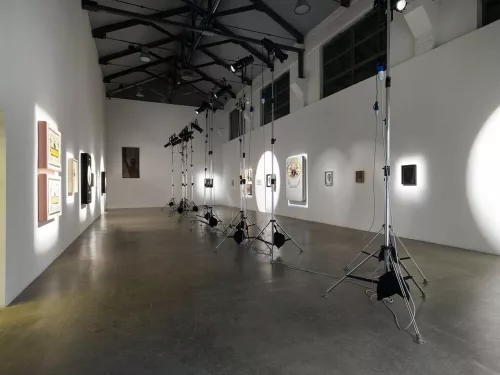 Nel grande salone d’ingresso, l’unico con un allestimento che ha del teatrale, disegni e opere pittoriche riempiono le pareti bianchissime. Non sono autoritratti - non si arriva a tanto - ma sono possibili interpretazioni di se stesso, fantasie, forse anche rimorsi di scelte non fatte, ragionamenti che portano a diverse declinazioni di sé in un’unica insistente autocelebrazione. Ogni suo volto non è altro che una proiezione della propria possibile identità. Salta all’occhio, tra tutto, la serie di autoritratti incorniciati nella grafica di sigari di basso costo. Schizzi con matite e tempere su fogli si alternano ritmicamente. Un unico soggetto, ma infinite declinazioni della sua personalità. Interessante l’allestimento e le scelte illuminotecniche, ma fin qui si stenta a trovare la parodia.
