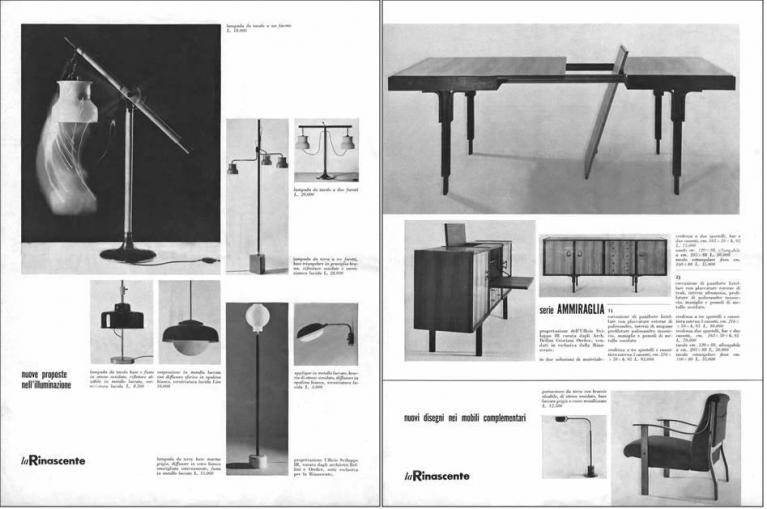 Mario Bellini e Roberto Orefice lampade per il Centro Design de La Rinascente, 1960-62, pagina pubblicitaria con grafica di Italo Lupi. Mario Bellini, Mario Cristiani Orefici e Roberto Orefice per il Centro Design de La Rinascente, arredi della serie Ammiraglia, 1961, pagina pubblicitaria con grafica di Italo Lupi.