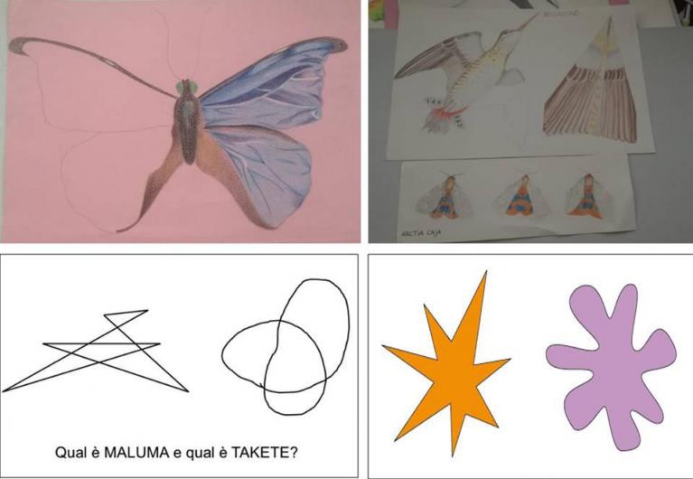 Roberto Orefice, alcuni lavori degli allievi del biennio propedeutico all’ISA di Monza. In alto: studi sul tema del volo. In basso: Maluma e Takete.