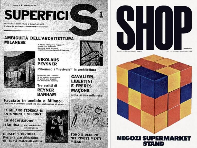 A sinistra: la copertina del nr. 1 della rivista Superfici, fondata da Leonardo Fiori; in questo numero apparve il pezzo del teorico dell’architettura britannico Reyner Banham (che scriveva sulla famosissima Architectural Review) nel quale polemizzava con l’articolo uscito nel nr. 0, 1960, scritto da Roberto Orefice e intitolato I baroni rampanti dell’architettura moderna, tre generazioni di architetti del dopoguerra italiano, pp. 23-30. A destra, copertina del nr. 1 della rivista Shop, 1969, con grafica di Italo Lupi, rivista per la quale Roberto Orefice ha scritto numerosi articoli.