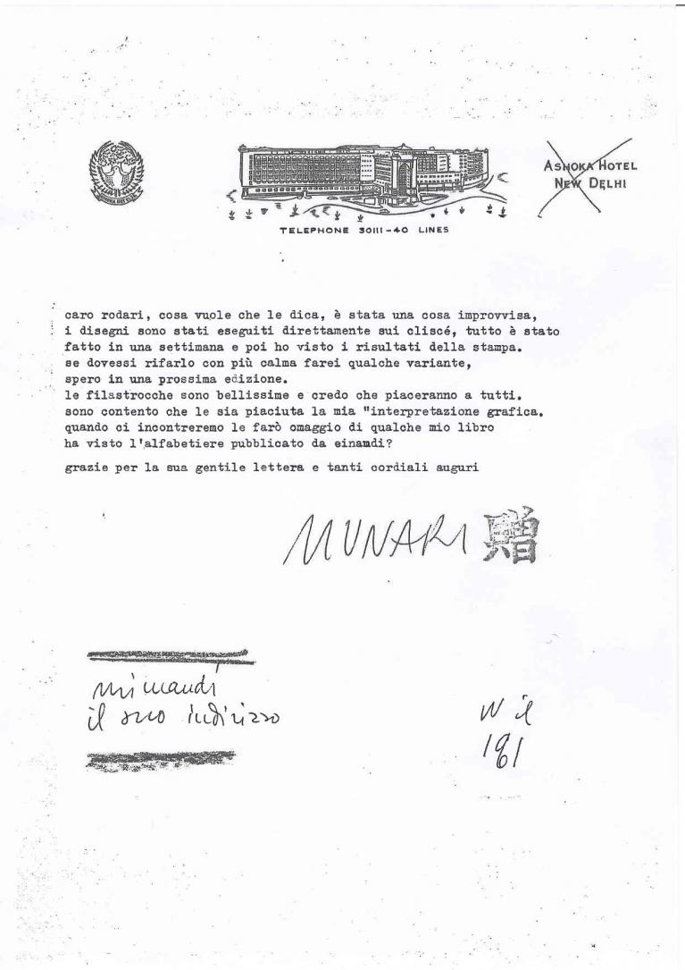 ho ricevuto le «filastrocche» e tocco il cielo con tutte e dieci le dita. Devo proprio dirle grazie dell'edizione bellissima, molto più bella di come potevo aspettarmela. Il libro rallegra piccoli e grandi solo a sfogliarlo e ispira una gran simpatia, credo di poterlo dire come se si trattasse del libro di un altro. In famiglia mi guardano e trattano con accresciuto rispetto, e per la prima volta posso chiudere la porta del mio studio (anche se ci vado a leggere un libro giallo). Insomma, ho ricevuto i calzoni lunghi: se ha dei nemici, disponga di me.
