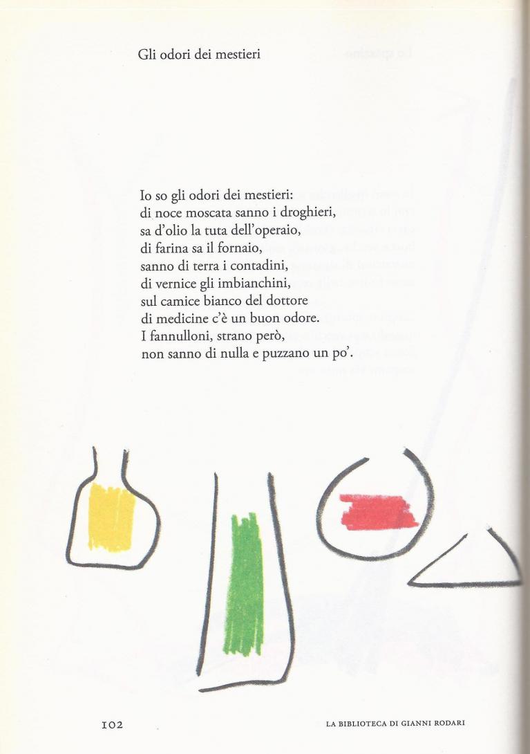 «Ci sono filastrocche allegre e ce ne sono tristi, proprio come nel calendario si incontrano giornate d’oro e giornate nere; ma filastrocche senza speranza non ce ne sono, non le so fare. La speranza e l’erba voglio, secondo me, crescono dappertutto, ai bordi delle strade, nei vasi sui balconi, sui cappelli della gente: basta allungare la mano e volere e il mondo diventerà più abitabile.»
