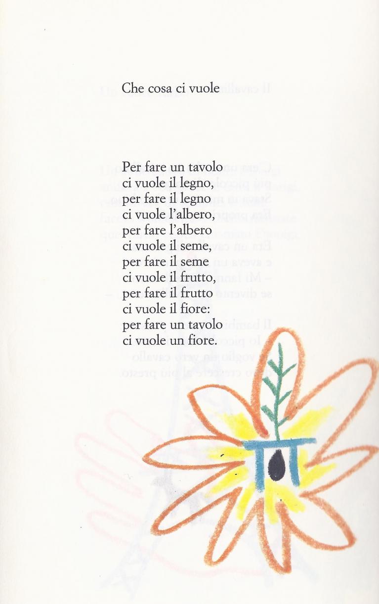 C'è un unico passo in cui Munari disegna tutte le immagini scritte da Rodari, che furono d’ispirazione anche per la famosa canzone di Sergio Endrigo. Fa così: «Per fare un tavolo | ci vuole il legno, | per fare il legno | ci vuole l'albero, | per fare l'albero | ci vuole il seme, | per fare il seme | ci vuole il frutto, | per fare il frutto | ci vuole il fiore: | per fare un tavolo | ci vuole un fiore».