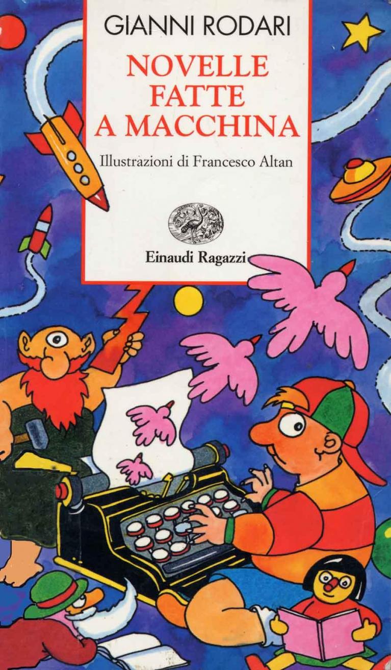 L’edizione delle Novelle che mi era stata regalata e che in questo momento ho tra le mani è quella tascabile, uscita nella collana per ragazzi Einaudi nel 1994. Come tutte le riedizioni rodariane di quegli anni, è illustrata da Altan, che avvicinava con naturalezza il mondo dello scrittore a un altro universo ampiamente esplorato da noi ragazzini, quello dei fumetti e dei cartoon. L’illustrazione di copertina raffigura un bimbo, cappellino da baseball e ciuffo ribelle, seduto un po’ sgangheratamente sulle ginocchia: batte sulla tastiera d’una macchina da scrivere come se fosse quella di un pianoforte, mentre dal rullo scaturiscono, alla stregua di note musicali, le figure e i personaggi che affollano il libro. Una bella immagine, che all’epoca ingolosiva oltre ogni misura la mia curiosità e che oggi mi sembra un modo molto efficace di riassumere visivamente un volume che trova la propria forza soprattutto nell’eterogeneità e nell’inesauribile ricchezza delle sue trovate narrative.