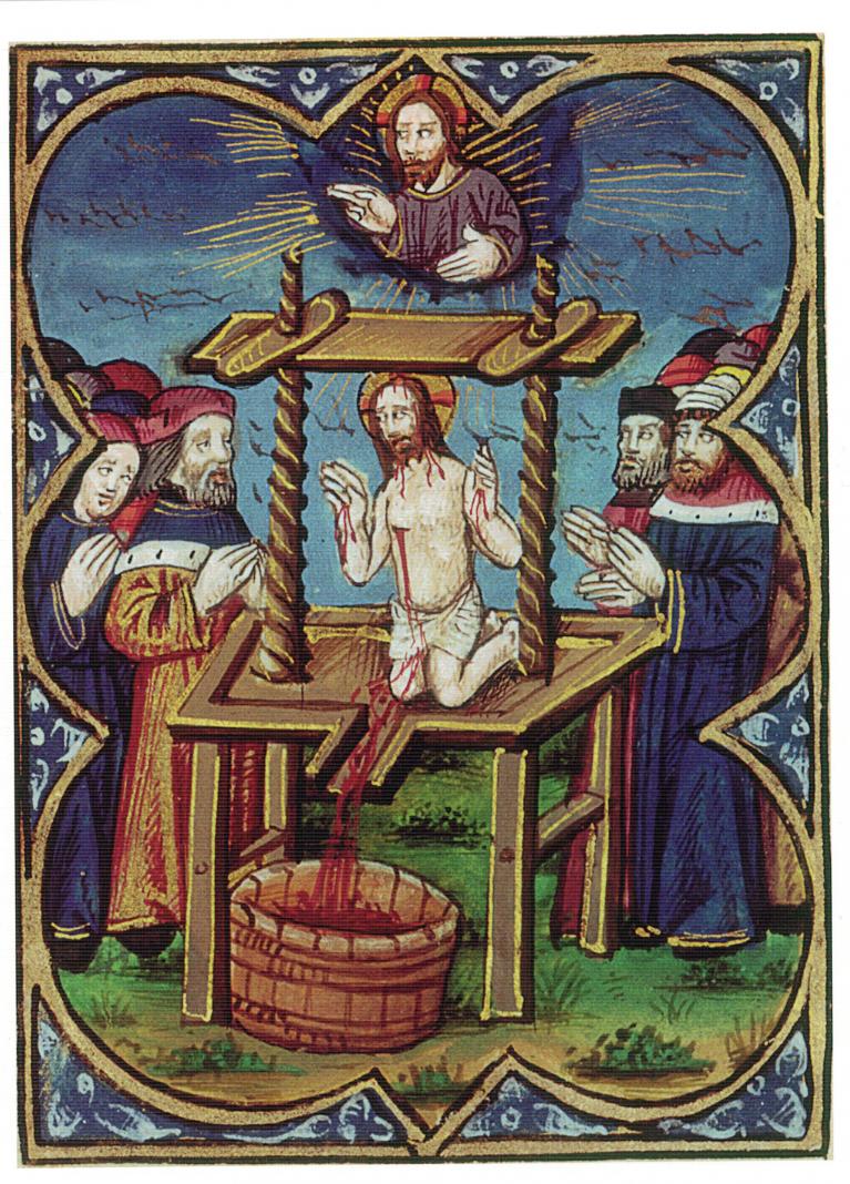 Ma è nel Medioevo che il rosso diventa il colore preferito dell'Occidente. Eppure mantiene la sua ambivalenza: da un lato esso colora il roveto ardente, il sangue sacro di Gesù, la Pentecoste, dall'altro anima le fiamme dell'inferno, il drago, la veste porpora e scarlatta della gran meretrice Babilonia nell'Apocalisse. A questo proposito un'immagine tratta da una Bibbia tardo-medievale raffigura un Cristo inginocchiato sotto un torchio con il suo sangue che cola in un tino. Nello stesso periodo il rosso caratterizza le vesti imperiali, come nel caso del mantello di Ruggero II di Sicilia, una cappa da cerimonia in seta rossa, ricamata con fili di oro e argento e ornata di quasi cinquemila perle, che raffigurano due leoni, cappa in uso fino al Settecento per l'incoronazione imperiale.