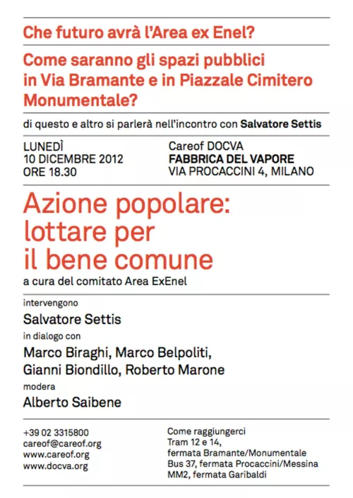 Questa sera presso Careof DOVCA (Fabbrica del Vapore, via Procaccini, 4 – Milano) si terrà un incontro con Salvatore Settis dedicato a “Azione popolare: lotta per il bene comune”, in occasione della pubblicazione del libro presso Einaudi, organizzato da Comitato Area Ex-Enel di Milano; in dialogo con Settis: Marco Biraghi, Marco Belpoliti, Gianni Biondillo, Roberto Marone; modera Alberto Saibene.