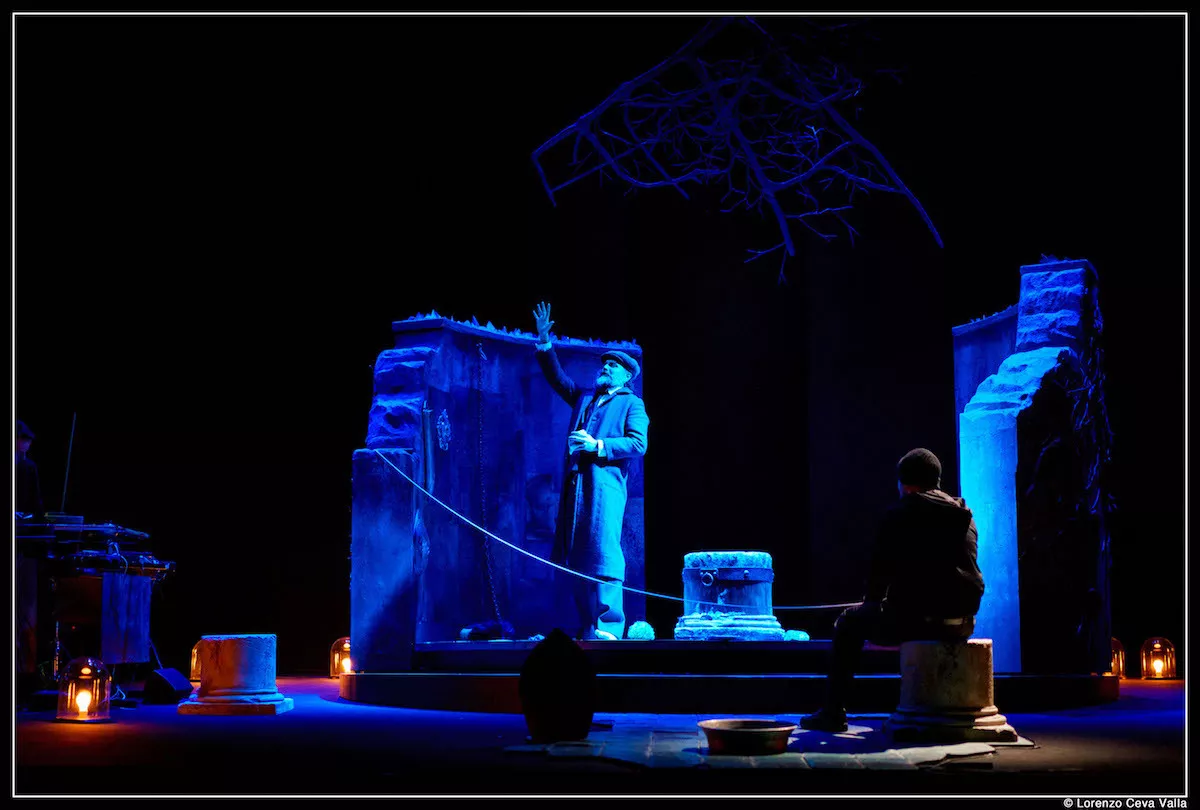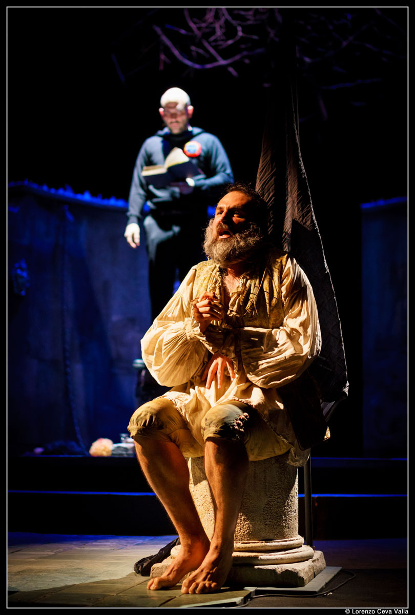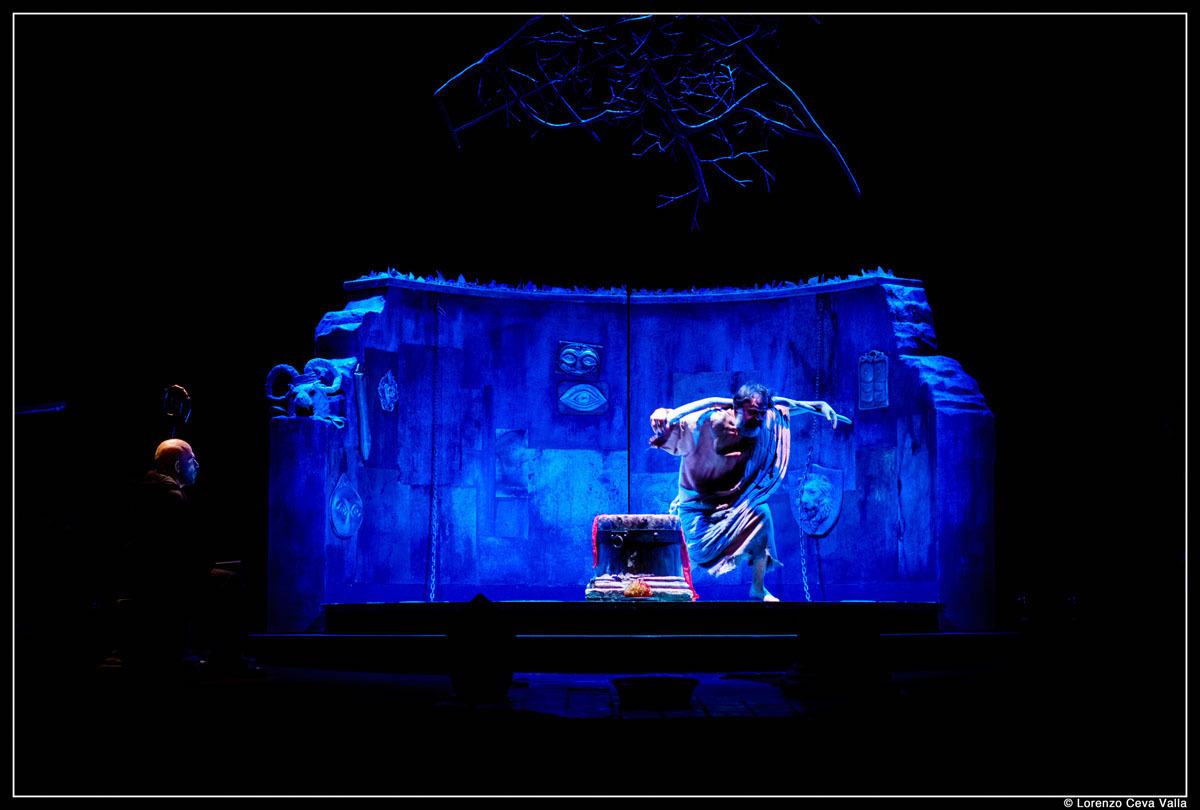 Ma il mito, come ben sapevano gli antichi, è strettamente connesso al rito: alle parole si sovrappongono le azioni, la dimensione quotidiana dell’esistere viene sospesa, i gesti sono volti ad invocare potenze superiori e invisibili. Tale funzione rituale è visibilmente esercitata in prima persona da Borrelli, che offre al pubblico il suo corpo e la sua parola come un officiante e pare incarnare i fantasmi evocati dal racconto di Saviano: scena dopo scena indossa maschere, teli, posture che paiono allontanarlo da una dimensione meramente umana. Ad accompagnarlo nel viaggio verso una forma atea di sacralità è la musica eseguita dal vivo da Gianluca Catuogno e Antonio Della Ragione: una ipnotica partitura sonora di organi e di tamburi, di berimbau e campane, elemento drammaturgico di unione tra le diverse parti dello spettacolo.
