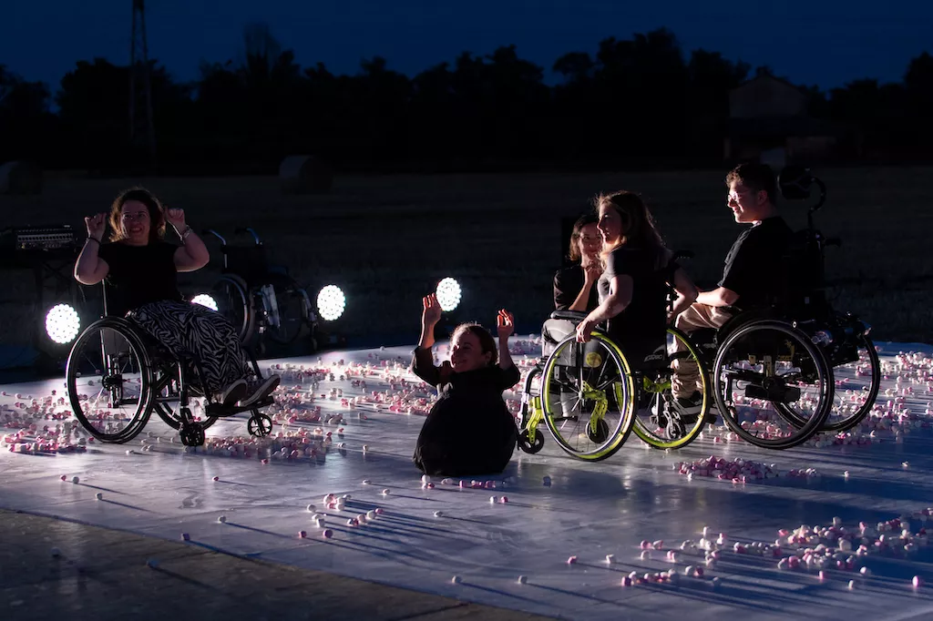 Chiara Bersani, con (nel) SOTTOBOSCO, sembra indicarci una via antipodica, la sua è l’artificializzazione del gioco dei bambini. Che fine ha fatto la fanciullezza che ci entusiasma, vedendo un tappeto bianco ricoperto di marshmallow, adagiato in un campo agricolo dorato, dopo la mietitura di luglio? Sul fondo, in lontananza, si accendono le lucine delle case e delle strade che digradano dal promontorio di San Marino. Nel campo stanno tante balle di fieno, da una di queste all’orizzonte sbuca una seconda danzatrice; Bersani intanto aveva saggiato il terreno col suo corpo minuto, quasi baciando il suolo coperto dal tappeto, come a volerne auscultare il respiro. La seconda danzatrice (Elena Sgarbossa) si avvicina, i loro arti s’intrecciano all’unisono, strisciano e si abbracciano, la danzatrice ‘grande’ prende in braccio la piccola, creando una nuova misura collettiva, insieme poi tornano a terra e si slacciano, guardando il cielo in attesa di qualcosa. È un attimo, ma ci pare di cogliere il momento in cui si creano le regole di una lingua: una delle due si tocca il mento, l’altra si accarezza un dito, poi ci guardano alzando le mani, infine nel tappeto bianco qualcosa si slabbra: sta facendo il suo ingresso un’altra figura, siede su una sedia a rotelle, poi entra ancora un’altra. Ma da dove stanno arrivando? Come mai non le avevamo viste prima? Gli stridori di corde tese, le ventate di cristalli del musicista Lemmo ora si trasformano in canto dolce. Udiamo la voce di Bersani, in una traccia in audio: “Dopo la fine, senza contorni, è solo questione di intensità”. Nella subitanea collettività di figure in scena, presenti grazie a un laboratorio condotto nei giorni precedenti, ora si spandono i sintagmi della lingua e noi ne impariamo i contorni: una si tocca il mento, un altro si accarezza un dito, ci guardano alzando le mani eccetera. Eccoci qui, testimoni di un gioioso incontro ravvicinato dove siamo noi le entità aliene, chiamati a decrittare i tasselli di una lingua che parla della realtà, se siamo disposti a giocarla.