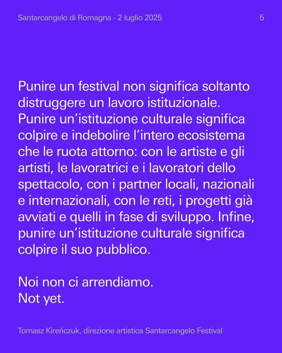 In questo tipo di contesti, c’è sempre da considerare poi il livello più materialmente politico: dal fronteggiarsi di partiti avversi agli accordi interni ai medesimi schieramenti, che comunque, qui e là, in tutta evidenza non si sono granché curati dell’impatto sulle centinaia di persone che rimarranno espulse da un settore in cui operano, magari da decenni; si va anche dal lascito di pratiche che – come suggerisce la riflessione condivisa dal Teatro delle Moire – per anni hanno infragilito le aree più delicate del comparto, fino all’avvento di una nuova governance autoritaria ora impegnata a imporre la propria monocultura, fra l’altro rideclinando in chiave ideologica aberranti strumenti amministrativi appunto predisposti in passato da altri. Nell’ultima conferenza stampa di presentazione del Festival, Tomasz Kireńczuk – che ha dovuto lasciare la Polonia vari anni fa – ha raccontato come, nel suo Paese, si sia proceduto in maniera analoga: prima cambiando sensibilmente le norme, poi posizionando figure allineate nei ruoli decisionali e, infine, intimidendo chi non si adegua alla visione tracciata.