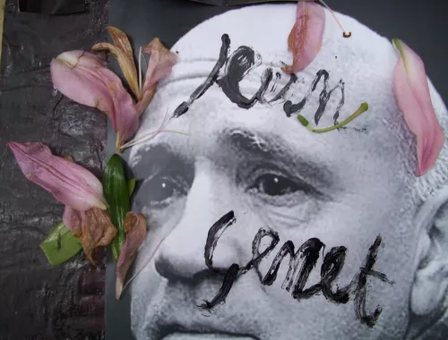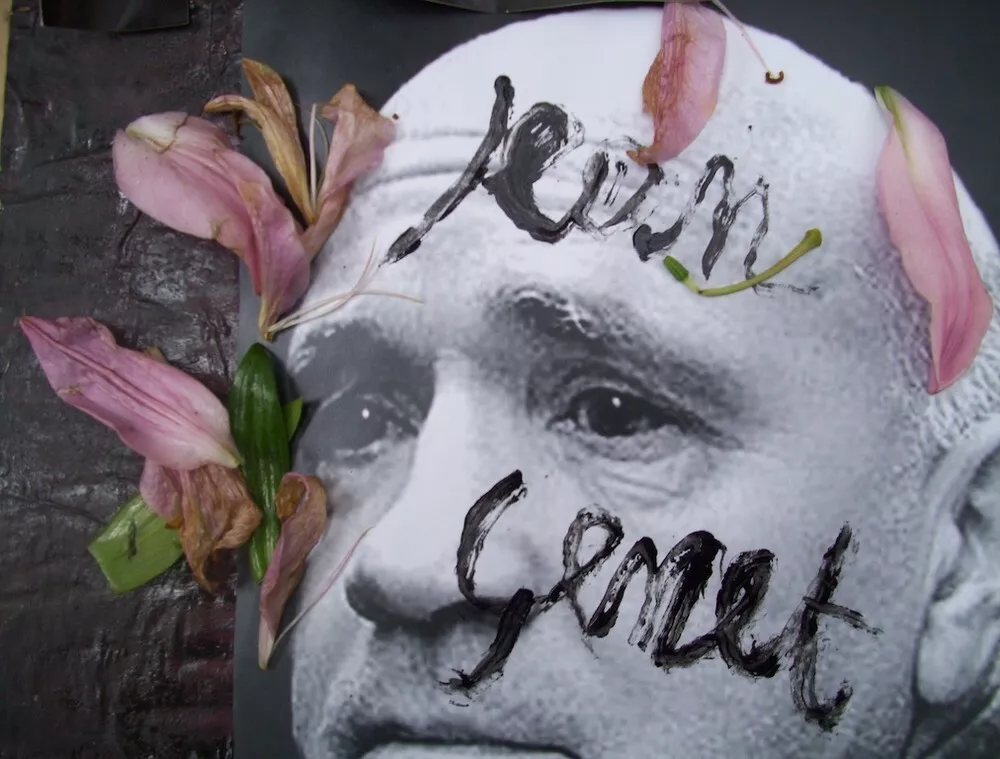 In Santo Genet Commediante e Martire lo spettatore è accolto da una madame Irma che è pure Notre-Dame-des-Fleurs, lo stesso regista in abito lungo nero, trucco e espressione androgina, cilindro e cornice di rose intorno al volto. Ambiguamente, nel cortile del carcere, fa cenno di seguirlo, mentre una figura orientale con lacrime d’oro dipinte in viso versa tè in un rito zen di purificazione che apre la strada in direzione di un corridoio tra una fila di sbarre e il muro della prigione.