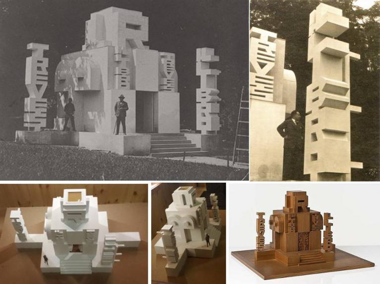 In alto: Terza Biennale Internazionale delle Arti Decorative di Monza, 1927: Fortunato Depero, Architettura tipografica, il padiglione del Libro per la Casa Editrice Bestetti-Tuminelli-Treves; l‘artista accanto a uno dei suoi totem. In basso: due viste della maquette del padiglione di Depero alla Terza Biennale di Monza; maquette dello stesso padiglione realizzata in legno di cedro da Pierluigi Ghianda nel 1978.