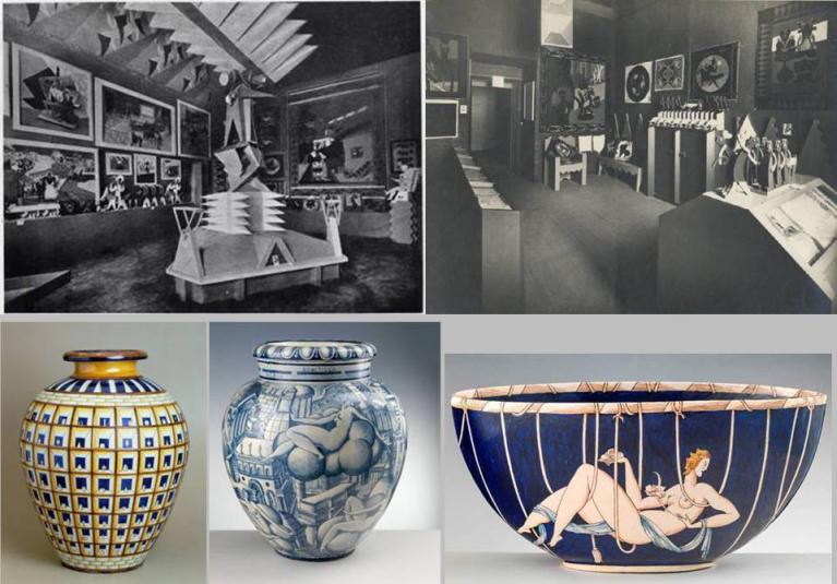 In alto: Sala Futurista e Sala del Trentino di Fortunato Depero alla I Mostra Biennale Internazionale delle Arti Decorative, 1923. In basso, ceramiche di Gio Ponti per Manifattura di Doccia Richard-Ginori: Vaso orcino Prospettica, 1923; Grande vaso Donne su nubi, 1923; Vaso Donatella su corde, 1927.