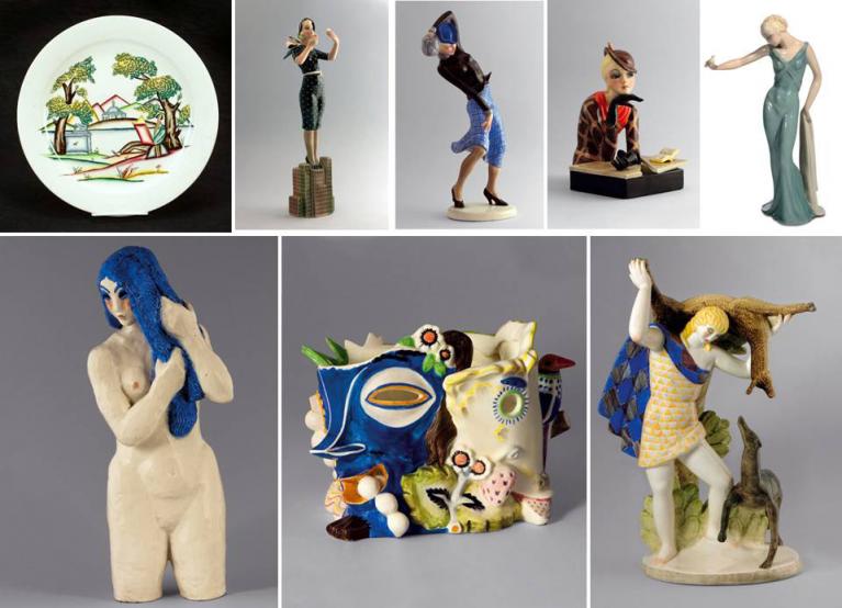 In alto, da sinistra: per SCI Laveno, Guido Andlovitz, Piatto del Servizio Monza 99, Le bellezze del Lago Maggiore, 1927. Per Manifattura Lenci: Abele Jacopi, Il grattacielo. Ultimo tocco; Helen König Scavini, Colpo di vento; Helen König Scavini, Al caffè. Per EsseVi: Sandro Vacchetti, Istantanea veneziana. In basso da sinistra, per Manifattura Lenci: Gigi Chessa, Torso che si pettina (versione bianca); Mario Sturani, Vaso maschera; Giovanni Grande, Antilope.