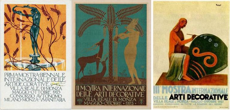 Giovanni Guerrini, Manifesti della Prima e della Seconda Biennale delle Arti Decorative di Monza, 1923, 1925. Marcello Nizzoli, manifesto della Terza Biennale delle Arti Decorative di Monza, 1927.