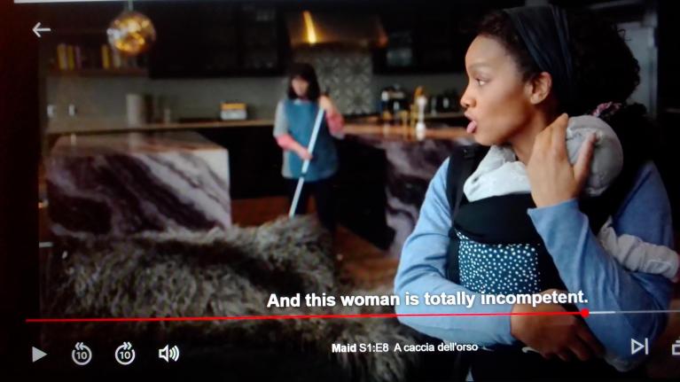 Ho estratto un fotogramma da una scena del terzultimo episodio. In primo piano si vede una donna con un neonato in braccio e sullo sfondo, fuori fuoco, un’altra donna che sta facendo le pulizie. La donna in primo piano è Regina, un ricco avvocato d’impresa con uno studio a New York e una casa di villeggiatura lussuosa e immersa nella natura, in cui Alex ha lavorato per conto dell’agenzia di pulizie. Quella in secondo piano è l’anonima collaboratrice domestica che ha rimpiazzato Alex da quando quest’ultima è stata licenziata in tronco. Regina sta parlando al telefono proprio con Alex e le sta chiedendo dove sia finita e perché non si faccia più vedere. L’ha presa in simpatia, ha riconosciuto il suo valore e vorrebbe che tornasse a lavorare per lei anche senza la mediazione di un’agenzia. È disposta a pagarla bene. In più è scontenta della persona che l’ha sostituita, la donna anonima in secondo piano, e si lamenta ad alta voce della sua totale incompetenza, facendosi intenzionalmente udire dalla poveretta. Regina è tecnicamente una stronza e lo è stata soprattutto con Alex, all’inizio della storia.