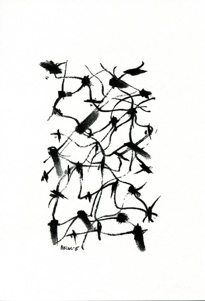 TP: In un libro di Roberto Calasso, Il cacciatore celeste, c’è una frase detta dal custode d’una caverna con incisioni preistoriche: “Todos los adornos son escrituras”: “ogni immagine è un testo scritto”. Significa che le immagini raccontano, usando dei segni, dei gesti che compongono un alfabeto, e sono riconducibili a parole. Gli alfabeti nascono da gesti tracciati sui muri delle caverne, quindi dal gesto che voleva rappresentare un’immagine. Non sono un antropologo, ma penso che questa possa essere una spiegazione plausibile del rapporto tra pittura e scrittura. La prima linea è stata quella che ha definito il mondo. Se non ci fosse la linea noi non sapremmo bene com’è fatto un albero o una bottiglia. L’invenzione della linea ha prodotto tutta una serie di forme espressive e conoscitive che vanno dalla pittura alla scrittura, e anche alla simbologia.
