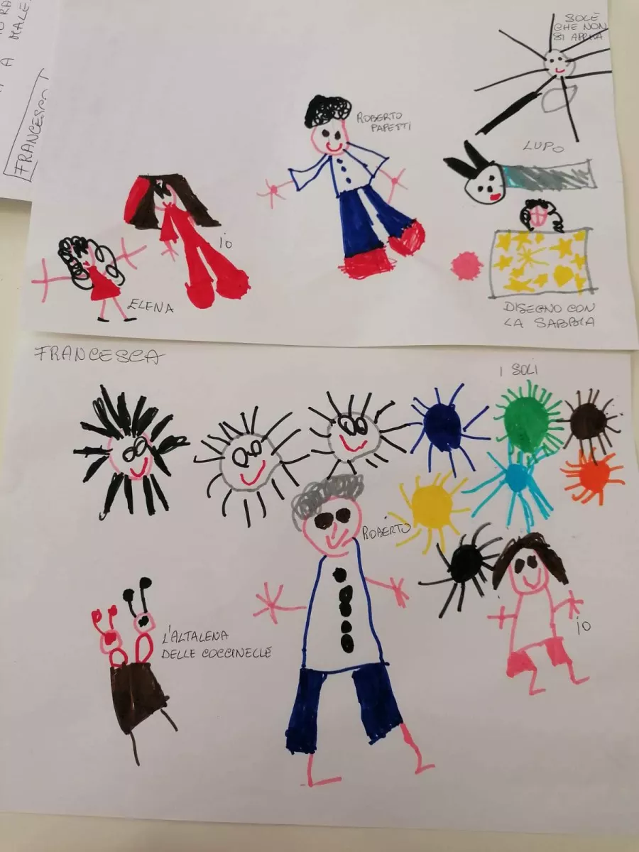 Il tondo del sole, da cui partono per rappresentarlo disegnando, è statico, bonario, ridente, a volte colorissimo, a volte pallido e scarmigliato. È il compagno spesso di una piccola casa con accanto l’alberello, gli uccelletti e i fiorellini. Qualche volta quel tondo scarabocchiato che riflette emozione segrete, lo impiastrano di intonaco di borotalco, ne spalmano le labbra di ketchup, ne tatuano le guance con pennarelli multicolori come la tavolozza di Paul Klee. Quel tondo è la pista dove saltano e fanno capriole i Pulcinella di casa, dove cresce una ziggurat sulla piana riarsa di un parcheggio condominiale o una torre inclinata che proietta l’ombra imbronciata di una metafisica ora del giorno.