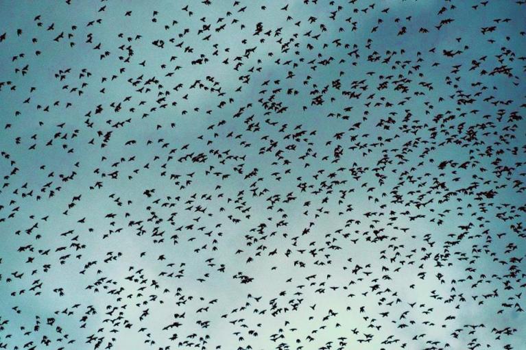 Durante la pausa esco fuori a mangiare. Per la strada, sopra i pali della luce, sugli alberi del parco, ovunque, vedo gli storni. Sono tantissime. Gravano sui rami, sui fili elettrici. Anneriscono il cielo.
