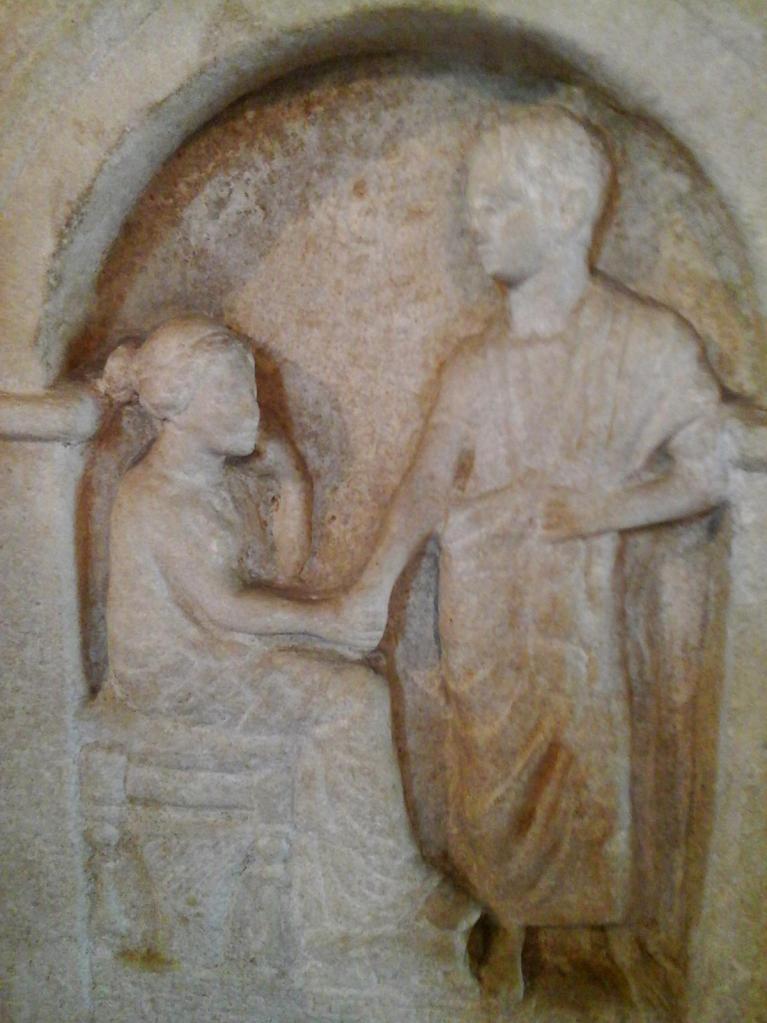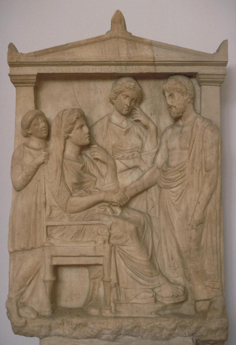 Tanto che, uso pervasivo nel mondo greco fin da epoca arcaica, scambiarsi la stretta di mano divenne geroglifico del commiato tra vivi e morti. In un repertorio vastissimo di pitture vascolari e bassorilievi su stele funerarie, si esprime in questo modo l’ultimo contatto tra chi se ne va e chi resta. Sono scene di notevole tensione, gravi eppure delicate, intime, spesso ricche di dettagli caratterizzanti, che definiscono le figure nella loro singolarità. Si tratta quasi sempre di coppie, nelle combinazioni più varie di età, sesso, status: amanti che si toccano teneramente, coniugi attempati, genitori che piangono bambini e bambine, giovani che accompagnano vecchi, amici e congiunti con ornamenti di diverse fogge, sguardi che si incrociano, capo chino, volti offuscati da una mestizia lieve e struggente. E sempre la stretta di mano.