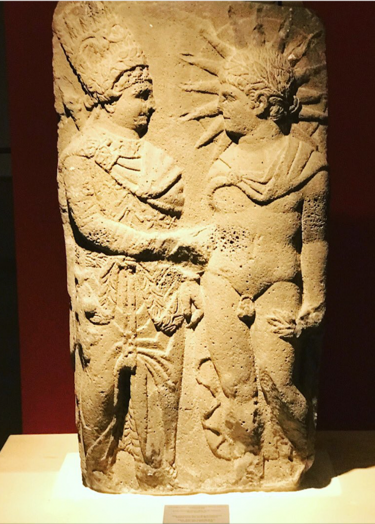 9th century b.C. stone relief depicts King Shalmaneser III of Assyria shaking hands with a babylonian