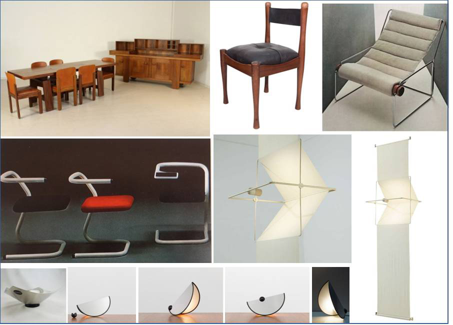 In alto da sinistra: arredi in legno di noce (Bernini 1964) e sedia Modello 620 (Bernini 1964); poltrona Londra 840 (Mobel Italia, 1973); al centro: sedia Gru (Bernini, 1970); lampada Quinta (Artemide, 1979); in basso: ciotola Lobo in foglio d’acciaio (Programma 7, Alessi, 1977); lampada da tavolo Don (Tronconi, 1975).