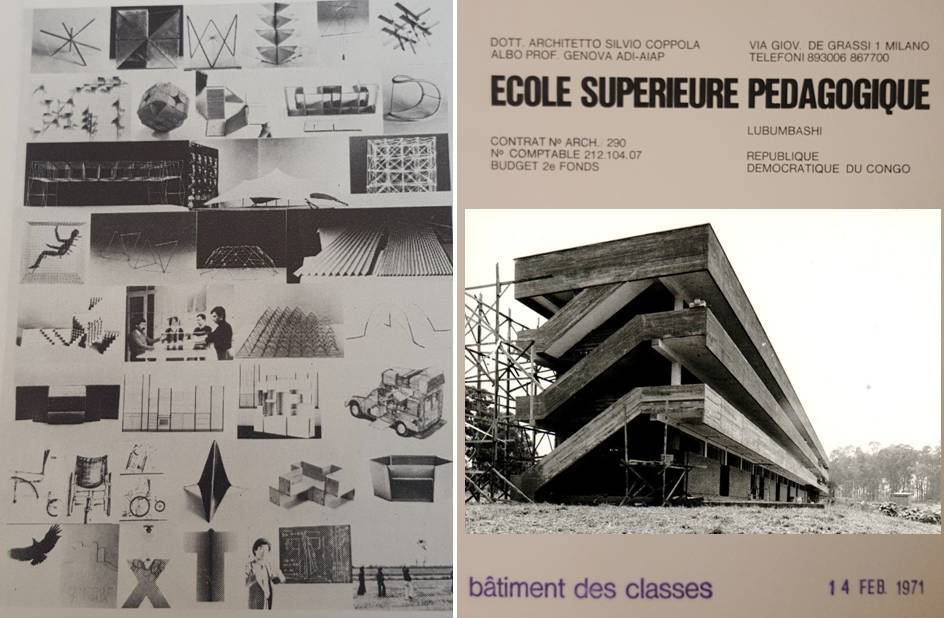 A sinistra: Silvio Coppola, ricerca sperimentale di un metodo di insegnamento, Accademia delle Belle Arti di Carrara; segnalato XI Premio Compasso d’oro, 1979. A destra: Silvio Coppola, 1971, Lubumbashi, École Supérieure Pédagogique, Copertina della Relazione di progetto con foto di un corpo di fabbrica in costruzione. (MIL Sesto San Giovanni. Archivio Giovanni Sacchi. Fondo Silvio Coppola).