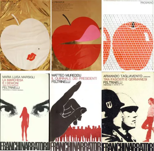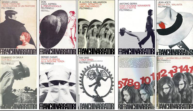 Ma è a partire dal 1970 che egli darà vita ad un linguaggio grafico inconfondibile capace di cambiare le regole della grafica editoriale, già seriamente messe in discussione da Max Huber, da Bruno Munari e da Albe Steiner. Quando Feltrinelli gli affiderà il progetto grafico della collana “Franchi Narratori” (1970-1983), egli avrà un autentico colpo di genio e si inventerà un format assolutamente rivoluzionario. In perfetta sintonia con gli argomenti suggeriti dai titoli della collana, sceglierà infatti di impiegare solo immagini forti, violente, come violento e forte era il contenuto dei libri sui quali esse sarebbero comparse, quasi avessero voluto aiutare il futuro lettore a prefigurarsi ciò che sarebbe andato a leggere. Si tratterà quasi esclusivamente di immagini in bianco e nero, a volte macchiate di rosso, e anche qui la citazione alla grafica di El Lissitzky e a quella del Bauhaus appare esplicita. Altra novità sarà rappresentata dalle presenza del nome della collana in copertina e dalle sue dimensioni, più grandi rispetto a quelle del titolo del libro e del nome dell’autore stesso, a voler significare che il dato più importante era proprio l’appartenenza del testo a quella collana. Anche il suo posizionamento nella pagina non ha precedenti, il nome della collana correva infatti ai piedi di ogni copertina, sulla bianca, sulla volta, e perfino sui risvolti interni.