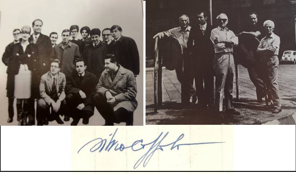 A sinistra: lo staff dello studio di Silvio Coppola in una foto comparsa sul primo numero della rivista Ottagono (1966). A destra: il gruppo ED (Exhibition Design) formato da Franco Grignani, Giulio Confalonieri, Pino Tovaglia, Silvio Coppola e Bruno Munari, in una foto apparsa sul nr. 30 della rivista Ottagono (settembre 1973). Sotto: la firma di Silvio Coppola (MIL Archivio Giovanni Sacchi. Fondo Silvio Coppola).