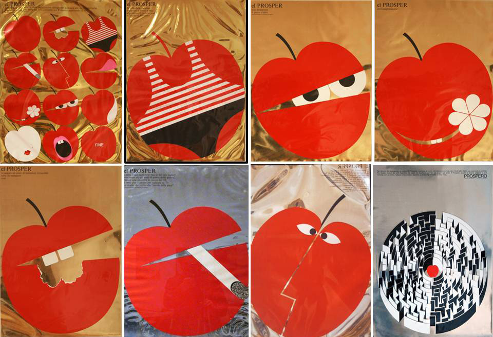 Vari manifesti pubblicitari del ristorante el Prosper realizzati in serigrafia su PVC, ideati da Silvio Coppola a metà degli Anni Sessanta, in cui egli usa il tema della mela, con dieci anni di anticipo su Steve Wozniak e Ronald Wayne che la impiegheranno nel 1976 nel logo di Apple (AIAP, Archivio Coppola, Fondo Diego Prospero)