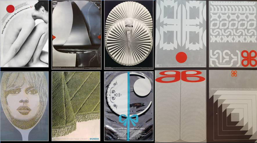 Alcuni manifesti realizzati da Silvio Coppola negli Anni Settanta: in altro tre manifesti per Laminati Plastici e due per Bernini; in basso, da sinistra, il famoso manifesto concepito insieme a Luigi Veronelli nel 1977: “In ogni bicchiere di vino l’immagine di una giovane donna”; due manifesti per Zucchi, e due per Bernini (Archivio Coppola, AIAP).