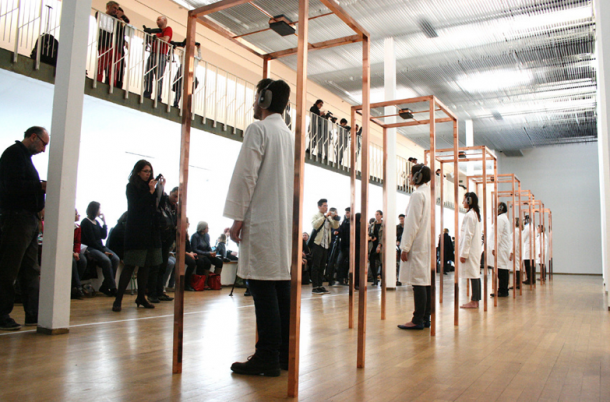 Ma la mostra di Milano è diversa. Esaurita la kermesse promozionale della prima settimana, ora Abramović is absent, The Method is present. Insieme a chi lo amministra e lo pratica, identificati dalla divisa d’ordinanza: un camice bianco, modello farmacista. Che serve a rendere tutti uniformi, cancellando le differenze d’abito e identità, e più gradevoli per l’obiettivo. “Visita la mostra e osserva il pubblico che diventa performance!” strilla festoso il sito web del Padiglione. Con savio calcolo strategico, Abramović ha riservato i primi due turni di performance (durante la conferenza stampa e durante l’opening serale) a giornalisti e giornaliste, in modo che dal giorno successivo i primi a bloggare pubblicamente le proprie sensazioni a mezzo stampa e via di seguito fossero dei professionisti della scrittura. Con utile ricaduta a pioggia. Ho letto reportage più o meno accorati, più o meno scettici, sull’effetto rigenerante del rimanere seduti, in piedi e sdraiati sopra e sotto cristalli e magneti, con una cuffia insonorizzante sulle orecchie, a sigillare fuori il mondo. Con l’acuta consapevolezza di essere osservati. Anche perché, a scanso di miopi, alla balconata del primo piano del PAC è fissata una dozzina di teleobiettivi, puntati sui partecipanti, come paparazzi di fronte a un red carpet. Per ritrosia, non sono convinta che il modo migliore di fare un’esperienza d’ascolto di sé libera dai recinti sociali dettati dalla tecnologia (niente telefoni, blackberry, iphones e compagnia bella, per due ore) sia esponendosi ininterrottamente allo sguardo altrui, e quindi, per me, niente camice e niente selenite. Osservo da esterna che Abramović è brava a gestire il pubblico e ad amministrarne le emozioni, così come a puntare sul topos artistico della vanitas. Ad avvantaggiarsi delle nostre ossessioni per l’apparire e il ‘collezionare esperienze’, in modo da appenderle subito alla parete delle nostre wunderkammern elettroniche, provando a sedurre lo sguardo altrui.