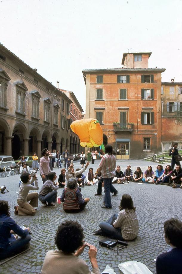 GS: È la chiusa del ’77, le ho fatte perché volevo in qualche modo riconciliare gli studenti con la città. Perché la mongolfiera parte, vola, e dove va? Bisogna correre, seguirla, cercare di recuperarla: l’azione è questa. Cosa dirà la gente? Il bolognese era stato scioccato dall’occupazione di Piazza Verdi, dal saccheggio, dalle vetrine rotte. Ha sempre amato i suoi studenti, Bologna, però in quel momento… ne abbiamo tirato su trenta, quaranta di mongolfiere…