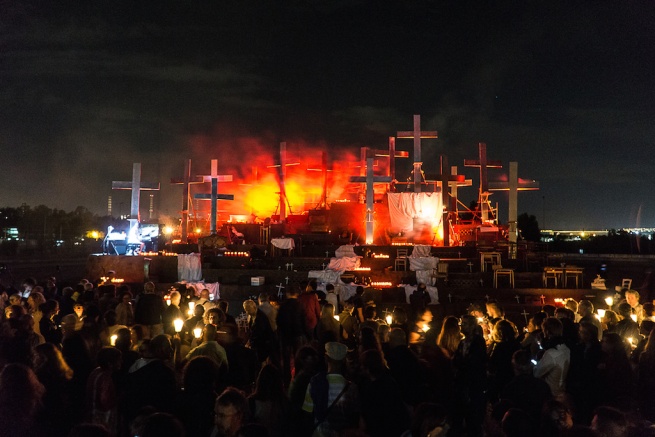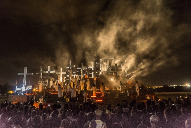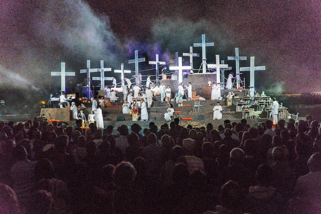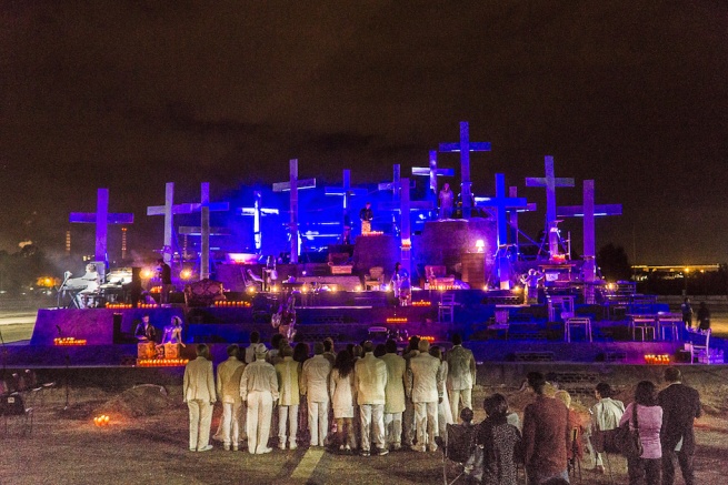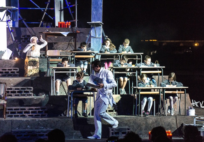 Punzo ha scelto un campo di atletica semiabbandonato, popolato solo da persone che vi vanno a fare jogging incuranti di trovarsi a poche centinaia di metri dalla ciminiera più alta dell’Ilva, la fabbrica dei veleni del rione Tamburi, tra polveri di ferro. Ha fatto costruire una gradinata e ha popolato di croci il suo Paradiso, un presepe di oggi in forma di Golgota. Gli spettatori vi erano condotto da una banda che eseguiva i classici motivi del Natale tarantino, le Pastorali, per poi intervenire, durante lo spettacolo, con musiche delle Passioni, sentitissime a queste latitudini. Paradiso-Golgota, simile alla nostra vita contemporanea, che fluiva sul palco in scene affidate a uomini e donne in bianco, mentre una classe di bambini in grembiulini neri e fiocco disegnava, ai banchi, faceva dettati, con parole compitate da un maestro che parlava di nazionalismi, di egoismi delle nazioni che agli inizi del ventesimo secolo avvelenavano il mondo. Musica continua, respiro, atti quotidiani, come in un presepe ingessato in una continua ripetizione di un quotidiano senza squarci: pulire le croci, i mobili, giocare a carte, leggere, bere, suonare, addormentarsi, stendere panni. Una condanna alla crocifissione dell’abitudine. Sullo sfondo del palco, nella notte invasa dai suoni continui della banda e da quelli di Andrea Salvadori, quasi un melodramma che giocava sull’emozione della musica, c’era l’Ilva, che di tanto in tanto sbuffava, come il retro della scena disegnata da Punzo, Alessandro Merzetti e Emanuela Dall’Aglio (che firmava anche i costumi), invasa periodicamente dai fumi bianchi, color piombo, rossi, a mimare, a ricordare.